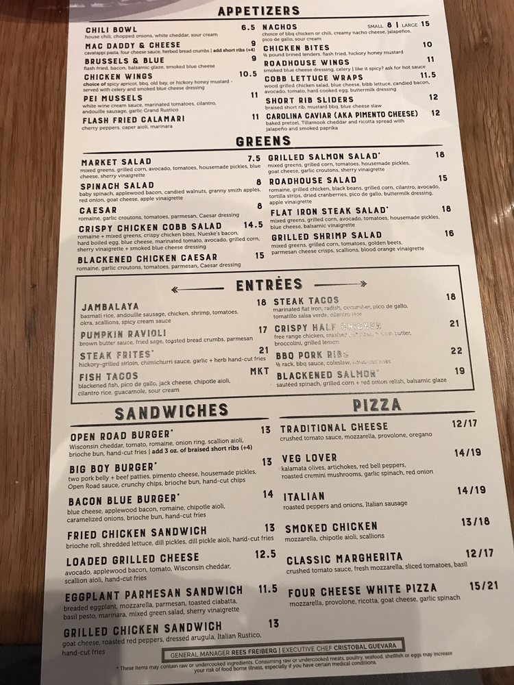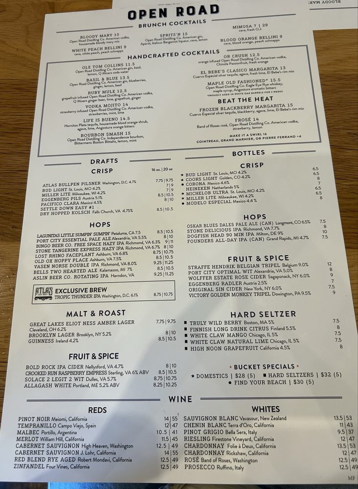 Introducing the menu at Open Road Grill, a New American restaurant and bar in Falls Church, VA. This restaurant offers a variety of amenities such as live music, free Wi-Fi, and a full bar. With a casual and family-friendly atmosphere, Open Road Grill has a diverse menu with many vegetarian options. Customers rave about the Wagyu meatball sliders, steak frites, and BBQ chicken nachos. The mac and cheese is a hit with picky eaters, while the Pull Up DC treats provide the perfect finish to a satisfying meal. The attentive service, cozy ambiance, and diverse menu make Open Road Grill a top choice for families and foodies alike. Don't miss their happy hour specials and outdoor seating options for a delightful dining experience.